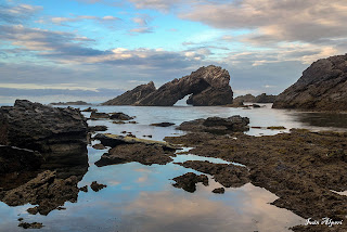 Una vez allí caminando un poquito hacia el este observaremos unas pequeñas calas gemelas que están partidas a su vez por un promontorio rocoso y una bella roca horadada que parece recostarse sobre el mar.El lugar lo conocía hacía tiempo pero no me había parecido entonces que hubiera bajada a la primera de las calas, pero en esta segunda visita al inspeccionar detenidamente el terreno adiviné un agujero en el promontorio que parecía dar paso desde la segunda cala al motivo de mi visita "La Roca recostada".Encontrar el sendero de bajada fue muy sencillo pues tenía el coche aparcado a escasos metros de este y a medida que descendía por él en zigzag y salvando la maleza, tuve claro que el agujero daba sin lugar a dudas acceso a la primera de las calas.Fue atravesar este y presentarme hasta el objetivo que me llevó hasta allí , por entonces el cielo se reflejaba nitidamente en la balsa de aceíte en la que se había convertido el en otras ocasiones furioso cantábrico , mientras, una pequeña roca a la izda semejaba un tronco petrificado